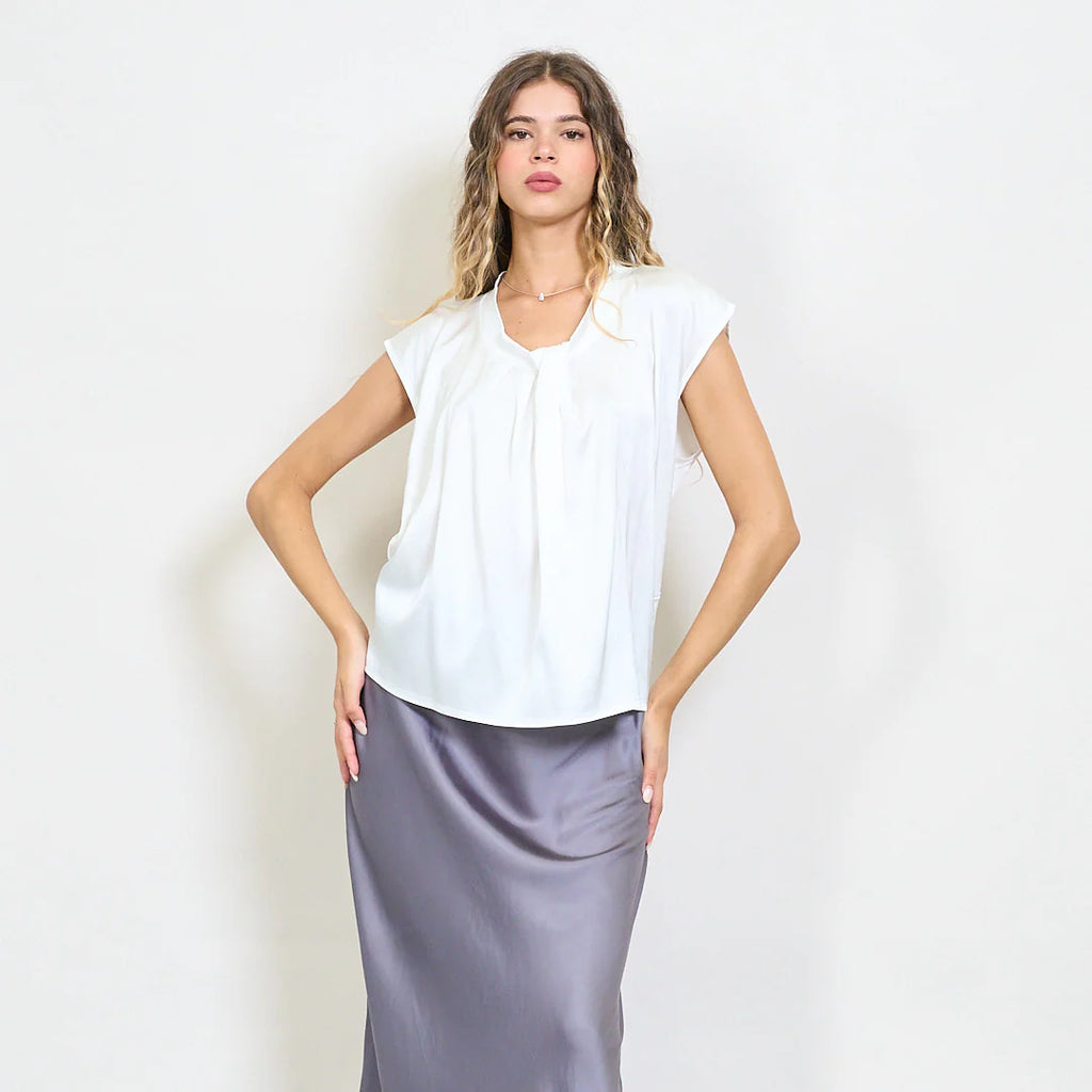 Draped front satin cap sleeve blouse