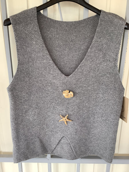 Stretchy knitted v-neck,free size tank top with fancy gold button detail.