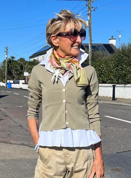 A versatile layer for spring days and summer evenings, the Guipure micro cardigan features a slim fit—slightly longer at the back—enhanced by raised ribbing that frames delicate open-work inserts for a sporty-chic finish. Crew neck with ribbed trim. Front button closure. Long sleeves. Side slits. Longer back. Raised ribbing. Cropped length above the hips. • Stretch nylon, lightweight, soft handfeel.