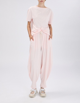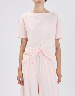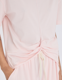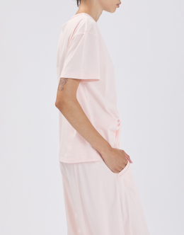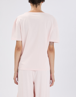 T-shirt with ample volume at the top that narrows at the bottom, resting on the hips. Refined rounded V-neck, refined trapeze sleeve (long above the elbow) with cuts under the sleeve to give more three-dimensionality. Straight line T-shirt with a distinctive knot at the bottom centre front, boat neckline and wide sleeves. The compact cotton jersey has a very good yield, especially for special workmanship such as the knotting on this model. A boxy T-shirt, long at the first hip, with straight sleeves above the elbow with a very high hem (as well as at the bottom of the body) and dropped lap. The mirrored macro-flower print enriches the front and extends to the back.