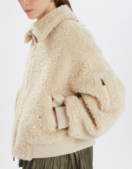 Soft and enveloping like a hug, this bomber is made from sherpa - a plush curly fabric that offers an eco-friendly, animal-free alternative to shearling. The oversized fit and bold pocket detailing add a modern twist, while the tone-on-tone nylon lining provides contrast and comfort. Turned-down collar. Front zip closure. Side flap pockets. Ribbed cuffs and hem. • Sherpa fabric, medium weight, soft handfeel. • Lined.