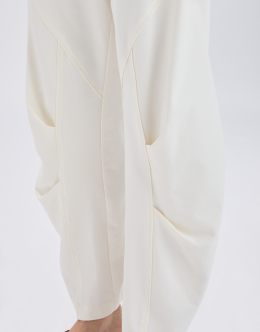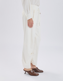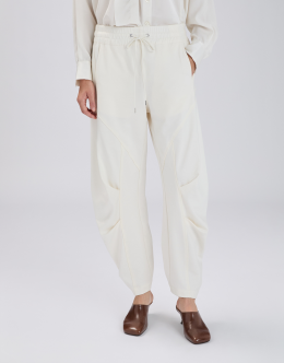 The Skittle jogger is reinterpreted with a couture twist, featuring a wide, curved leg enhanced by pleats and tucks at knee level that create fluid movement. The Punto Milano jersey, with its smooth and silky handfeel, adds a refined sheen. Elasticated waistband with adjustable drawstring. Slanted side pockets. Topstitching and pleats. • Punto Milano jersey, medium weight, soft handfeel.
