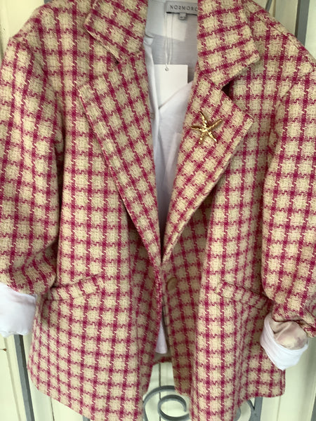 Loose fitting ,one size tailored check jacket with front pockets and button opening.