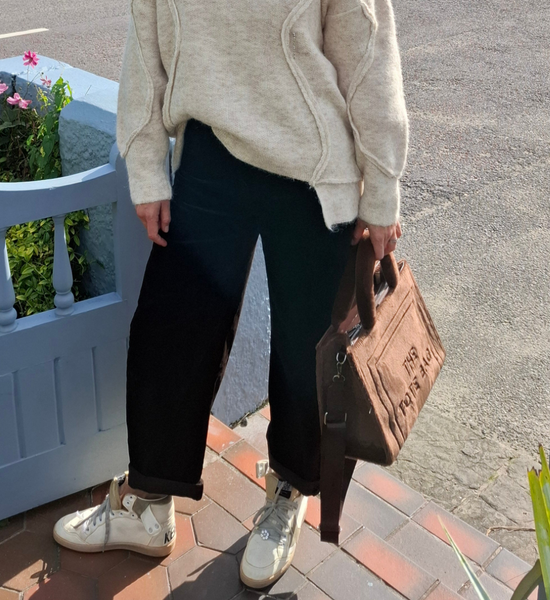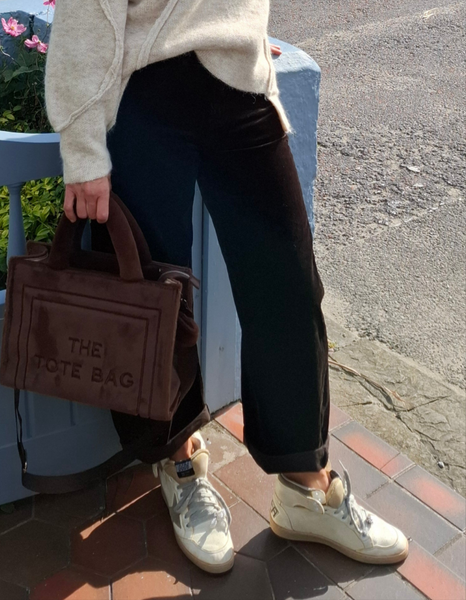 Soft velour like cords, barrel leg, full length. Regular pockets, great fit, stretchy material.